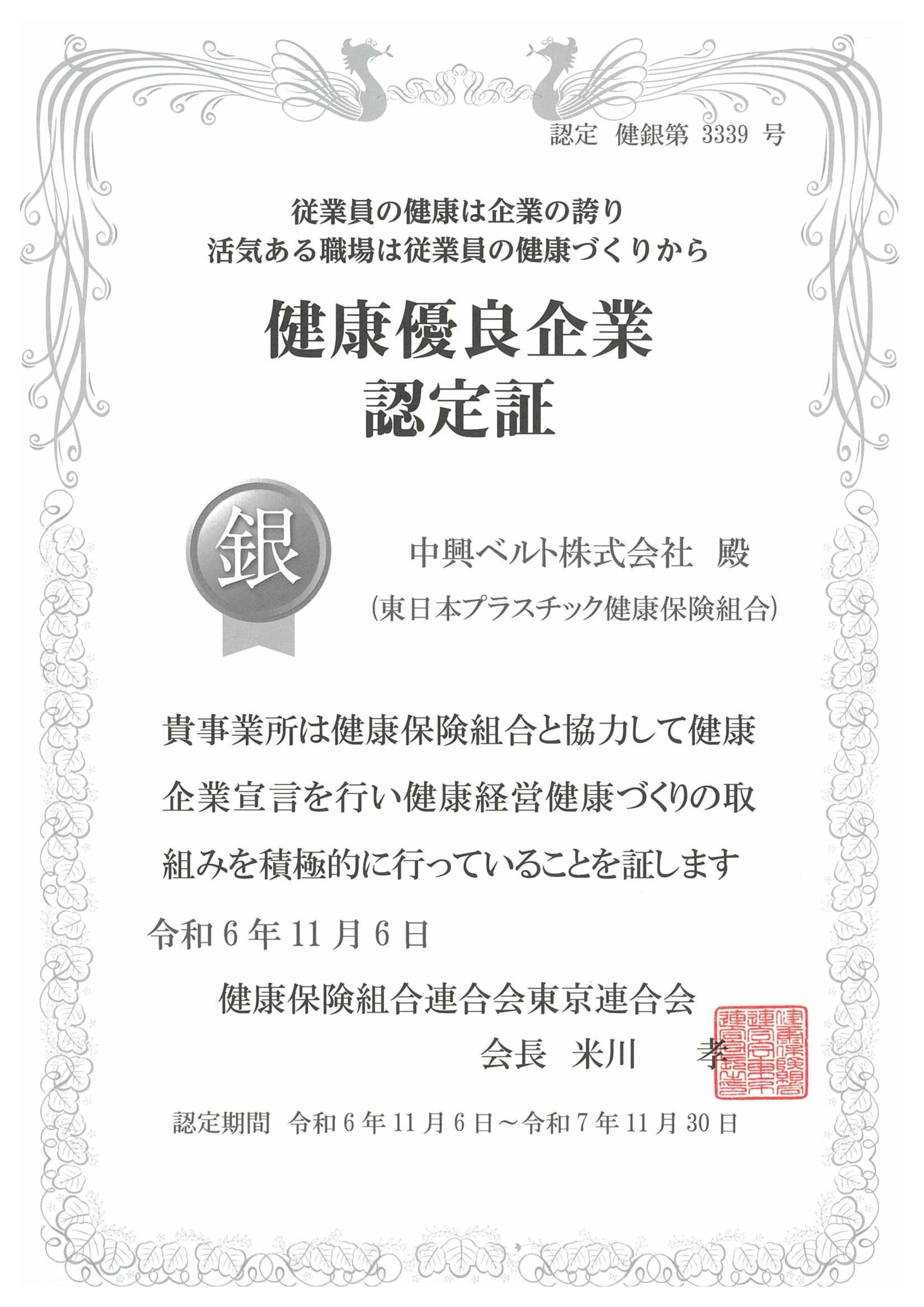 この度、中興ベルトは、健康保険組合連合会東京連合会へ「健康企業宣言」を行い、健康経営・健康づくりの取り組みを積極的に行っている企業として、 健康優良企業認定証「銀の認定」を取得しました。