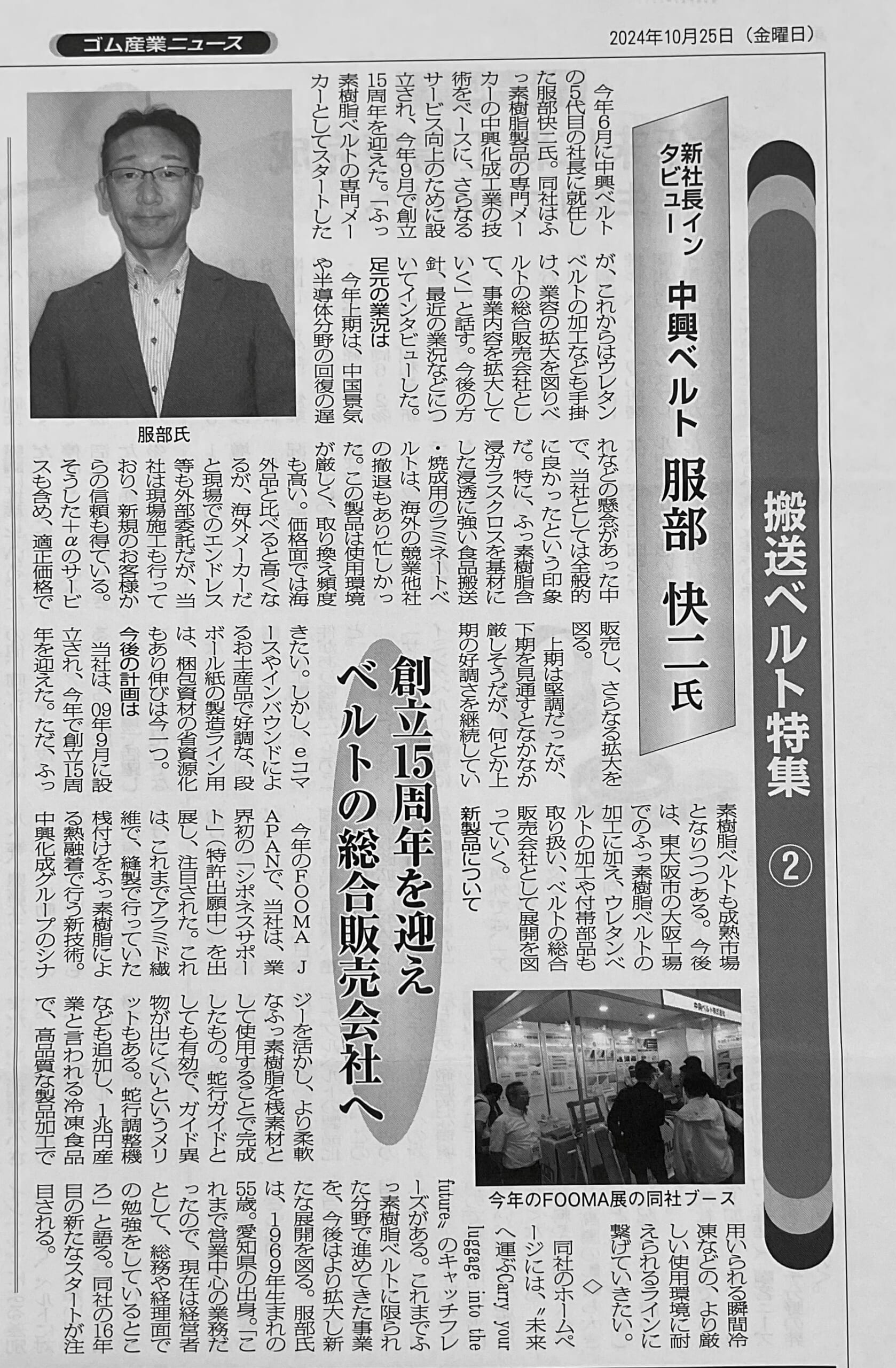 2024年10月25日(金)発刊のゴム産業ニュースに当社新社長のインタビューが掲載されました。 ふっ素樹脂ベルトだけでなく、ウレタンベルトの加工やコンベア装置の販売などの事業展開について紹介しています。 画像をタップ、クリックすると拡大します↓