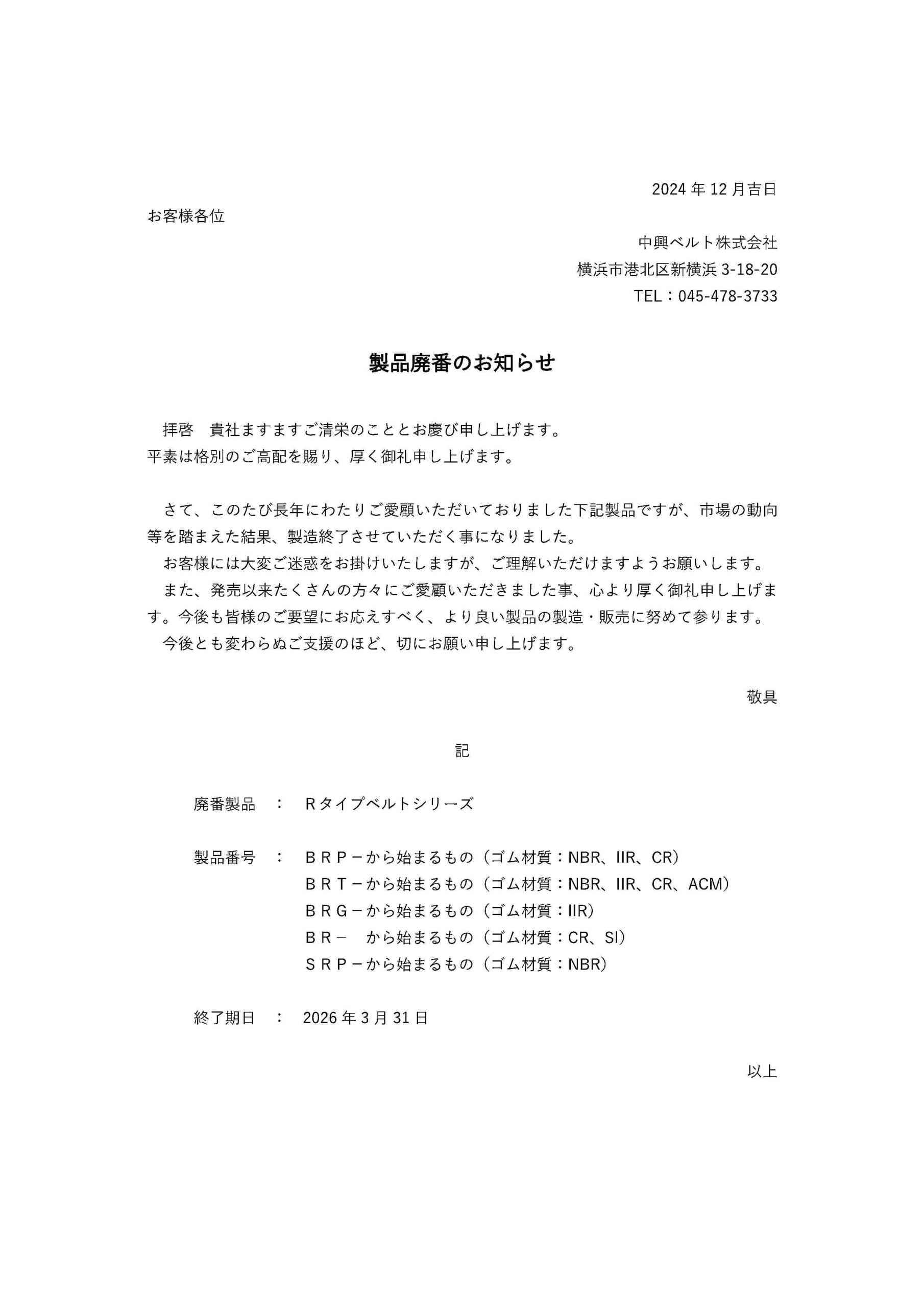 このたび長年にわたりご愛顧いただいておりましたRタイプ製品ですが、市場の動向等を踏まえた結果、
