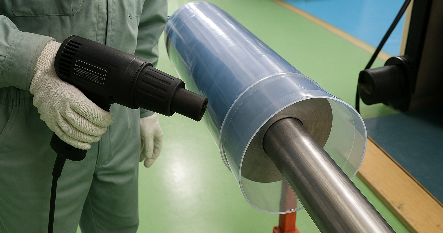 ふっ素樹脂熱収縮チューブ取付工事ふっ素樹脂熱収縮チューブを金属ロールなどに被覆することで ふっ素樹脂の特性を付与することが可能になります。高耐熱性や耐薬品性、滑り性の特性が生まれます。