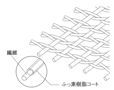 - メッシュ状のパラ系アラミドクロスにふっ素樹脂を含浸焼成した基材をベルト状に加工した製品です。