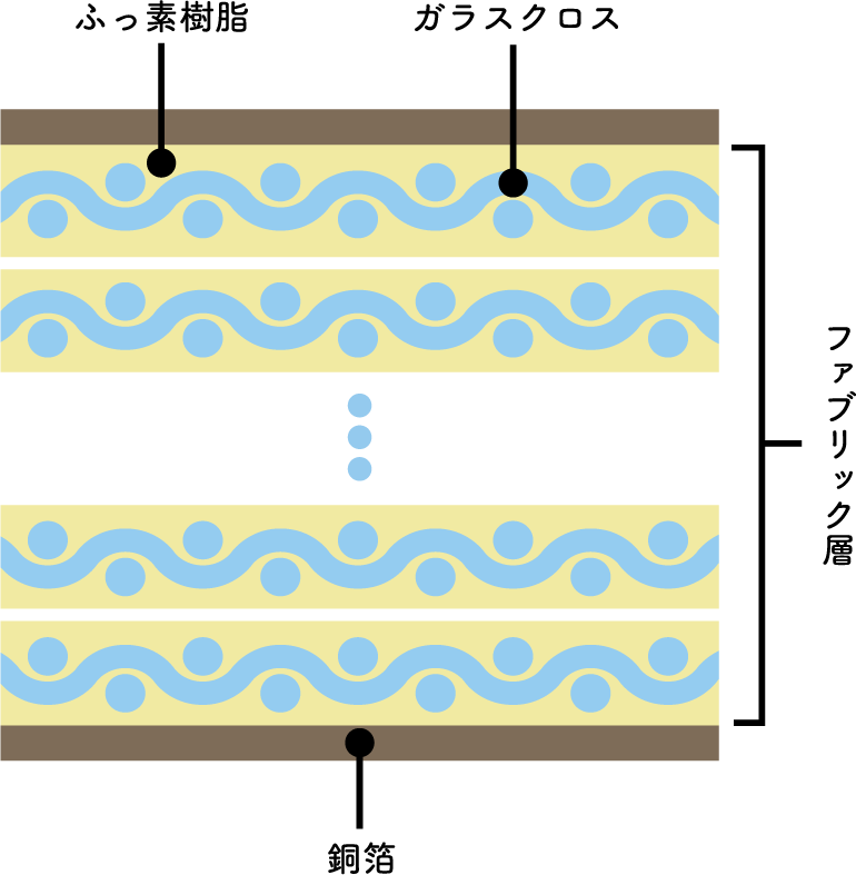 ふっ素樹脂基板は、ふっ素樹脂を染み込ませたガラスクロスを何層にも重ね、銅箔でサンドしたもの。ふっ素樹脂ならではの耐候性(太陽光や雨風に強い)を備えているので、外に置かれるアンテナにうってつけなのです。