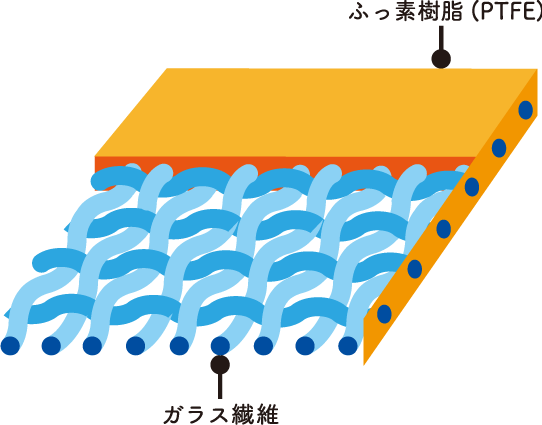 ふっ素樹脂膜材のベースは、耐熱性のあるガラス繊維で織ったクロス。そこに、ふっ素樹脂を染み込ませて、高温で焼きつけるとふっ素樹脂膜材が完成します。燃えにくい・汚れにくい・強度がある・音を吸収するなどのさまざまな特長を持っています。