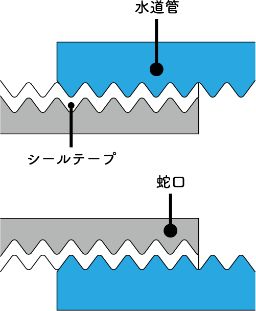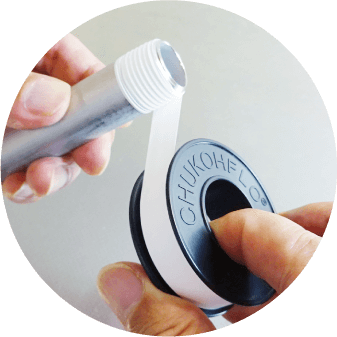 水道管と蛇口は、そのまま接続すると金属のネジ同士の間に微妙な隙間ができて、そこから水漏れしてしまいます。そこで、管のネジ部にふっ素樹脂製のシールテープを巻きつけた状態でお互いの管をねじ込む。そうすると隙間が埋まって水漏れを防げるというわけです。