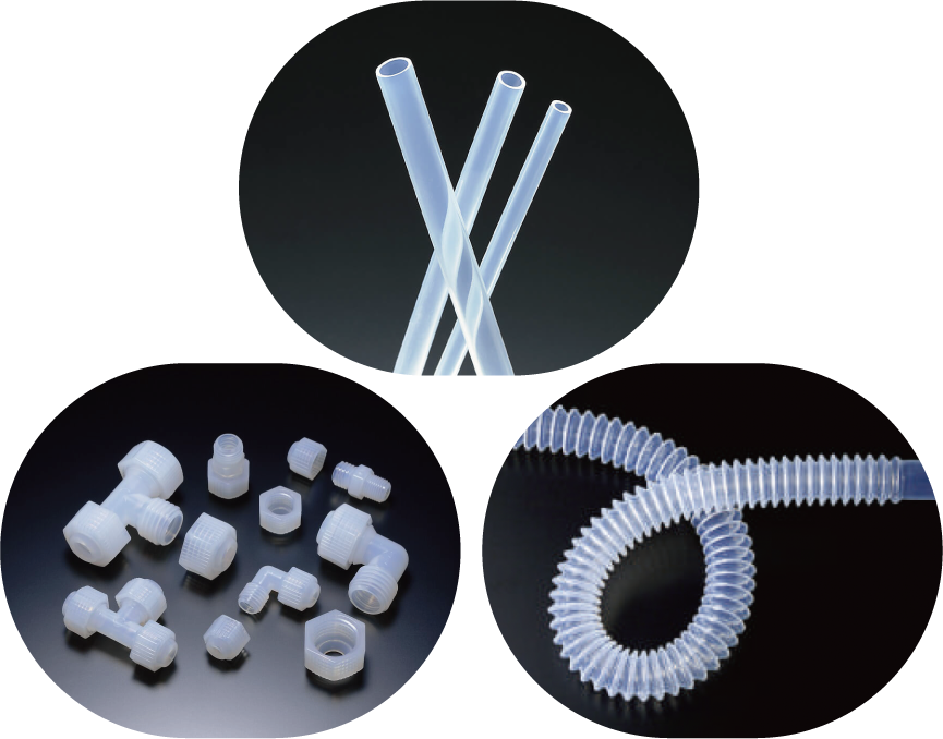 一体槽の他にもチューブやホースなど半導体製造に欠かせないパーツとして、中興化成のふっ素樹脂製品が応用されています。製品自体もクリーン度が高い環境で製造しています。