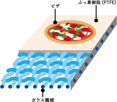 冷凍ピザの工場で使われているベルトは、ガラス繊維にふっ素樹脂をコーティングしたクロス。焼かれたり蒸されたり冷やされたり、過酷な環境でもしっかりと役割を果たします。