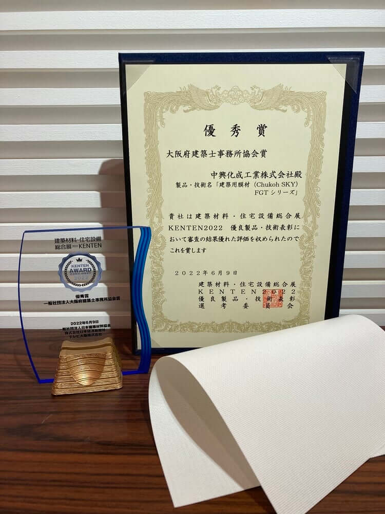 建築用膜材(Chukoh SKY)FGTシリーズが、「建築材料・住宅設備総合展 KENTEN2022」 優良製品・技術表彰(KENTEN AWARD2022)にて優秀賞の『一般社団法人大阪府建築士事務所協会賞』を受賞しました。