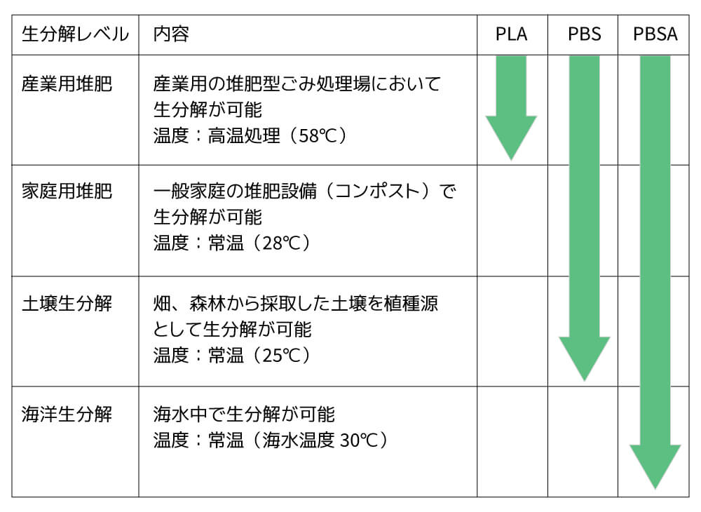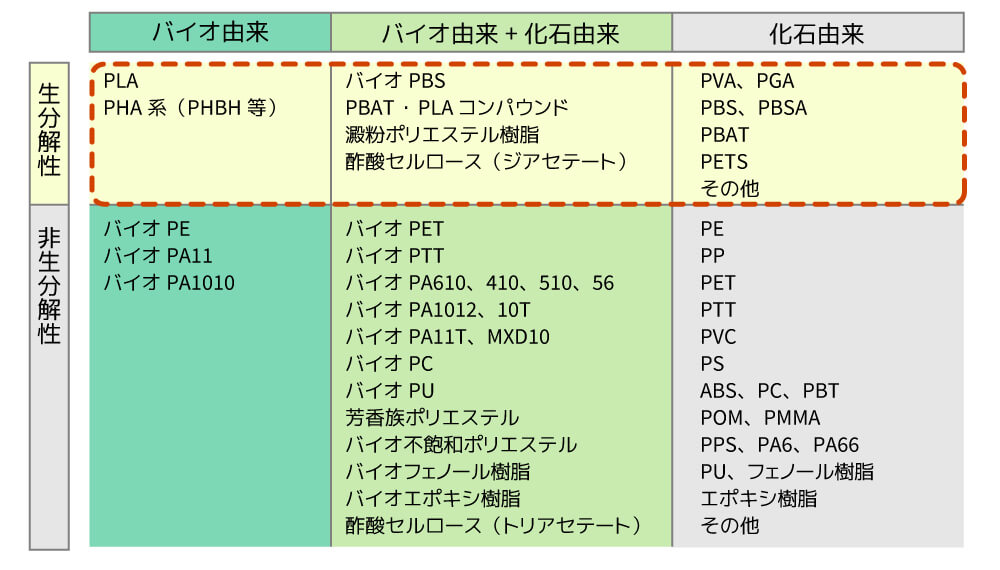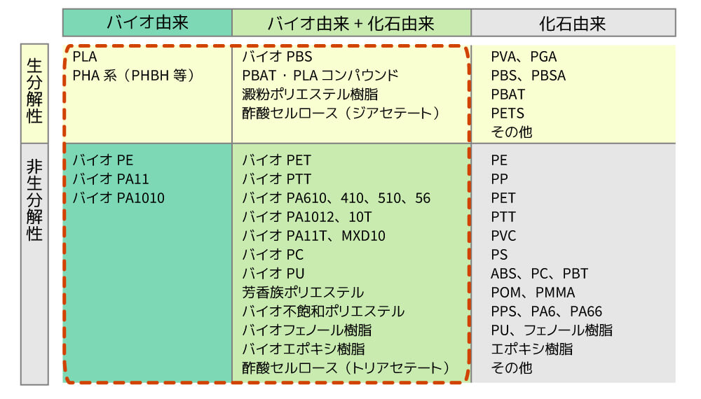 木材や綿花などのセルロース(多糖類)を原料とした酢酸セルロースや植物由来のコハク酸を原料に用いたBioPBS™など、バイオ由来の欠点である耐熱性や相溶性、柔軟性などを改善しながらも最終的には水と二酸化炭素に分解できる原料のこと。