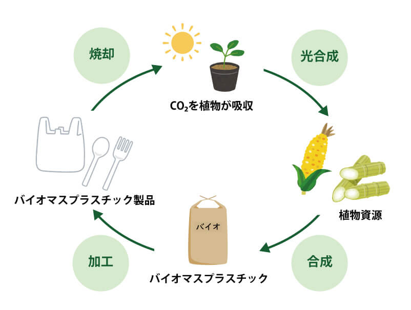 バイオマスという言葉は“再生可能な、生物由来の有機性資源で化石資源を除いたもの”を意味します。つまり、植物由来でできたプラスチックになり、原料の焦点を当てた呼び方なので「分解」するしないは言及されません。通常のプラスチックと同様に使うことができるにも関わらず、植物由来を原料としているため製造時には二酸化炭素が発生せず仮に廃棄時の燃焼等で二酸化炭素が発生しても実質的には大気中の二酸化炭素を増加させていない、というロジックで環境に優しいプラスチック素材になります。