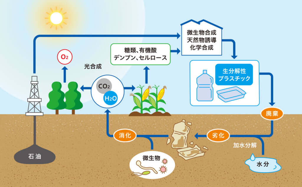 生分解性プラスチックは使用後の視点で『自然に還ることで環境に優しいプラスチック』で、バイオマスプラスチックは原料の視点で『製品の製造過程において環境に優しいプラスチック』といえます。