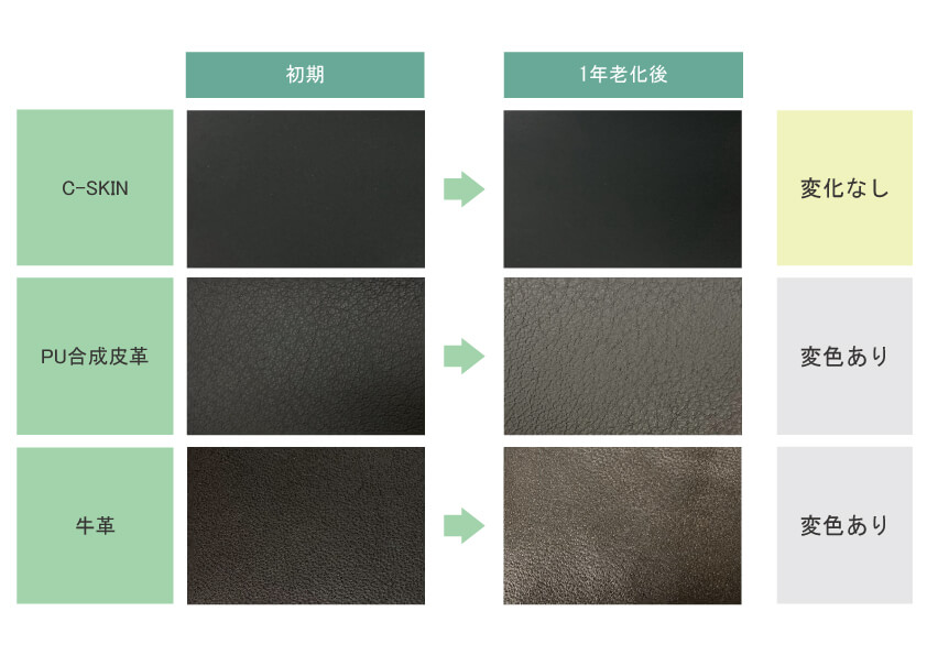 ポリウレタン樹脂(PU)やポリ塩化ビニル(PVC)は空気中の水分や熱、紫外線、手の皮脂などが付着することで劣化し、時間経過とともに少しずつ表面が分解され、脆くなってしまいます。 また、本革も紫外線を吸収することで、変色、硬化が著しい材料ですが、「シリコーン樹脂」は耐候性が高いため、C-SKINは紫外線の影響は小さく、耐寒性や耐熱性も備わっています。そのため、自然環境に左右されずに屋外での利用が可能です。