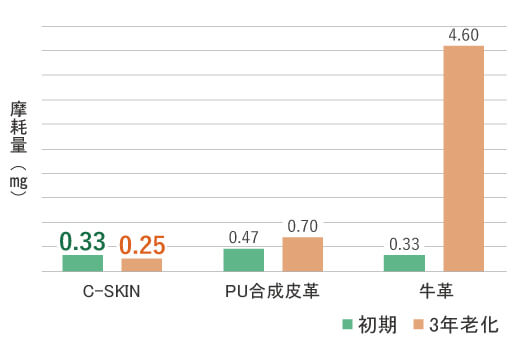 スラスト摩耗試験を行ったところ、本革が3年老化後の摩耗量が4.60mgだったのに対して、C-SKINは0.25mgと非常に摩耗しにくい結果となりました。