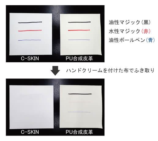 シリコーン樹脂は、表面張力が低く撥水性があり防汚性が高いため、ある程度の汚れは水拭きで除去することができます。社内試験では、C-SKINの表面を油性マジックで汚しても、布に油分を含んだハンドクリームを少量付け、ふき取ることで除去できることが確認できました。一般的な合成皮革は油分クリームもシミの原因となりますので、C-SKINの強みと捉えています。