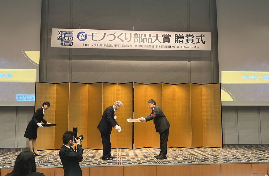 超モノづくり部品大賞はモノづくり日本会議と日刊工業新聞社が主催し、日刊工業新聞社とNPO法人ものづくり生命文明機構による審査委員会にて「機械・ロボット」「電気・電子」「モビリティー関連」「環境・資源・エネルギー関連」「健康福祉・バイオ・医療機器」「生活・社会課題ソリューション関連」の6分野を対象とした日本のモノづくりに寄与する卓越した部品・部材を広く募集、審査、表彰する賞です。