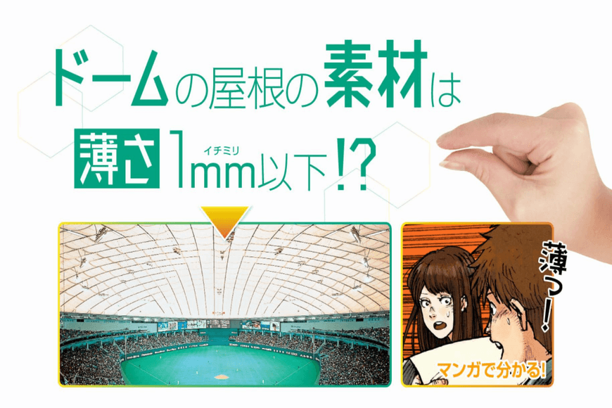 東京ドームの屋根膜材で有名な建築用ふっ素樹脂屋根膜材ChukohSky。 ChukohSkyはドーム以外にも数多くの駅のホームの屋根材として採用されています。 ふっ素樹脂屋根膜材の特性である耐熱性や不燃性の詳細についても紹介しています。 詳しくは下記をクリックしてご覧ください。 マンガで知る!中興化成のふっ素樹脂屋根膜材の実力 をみる
