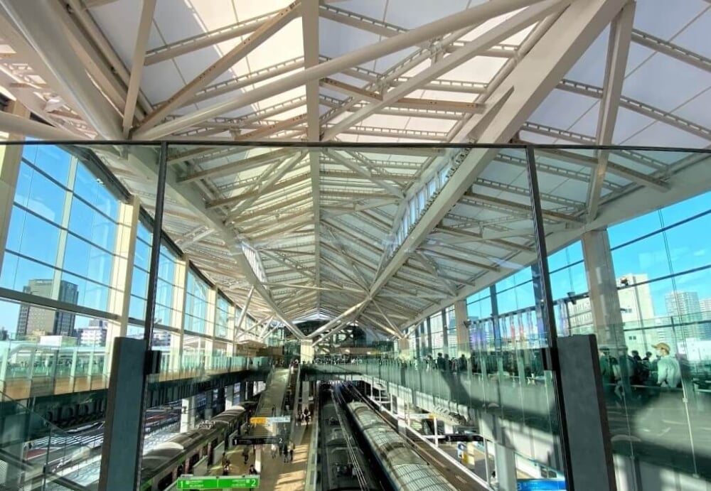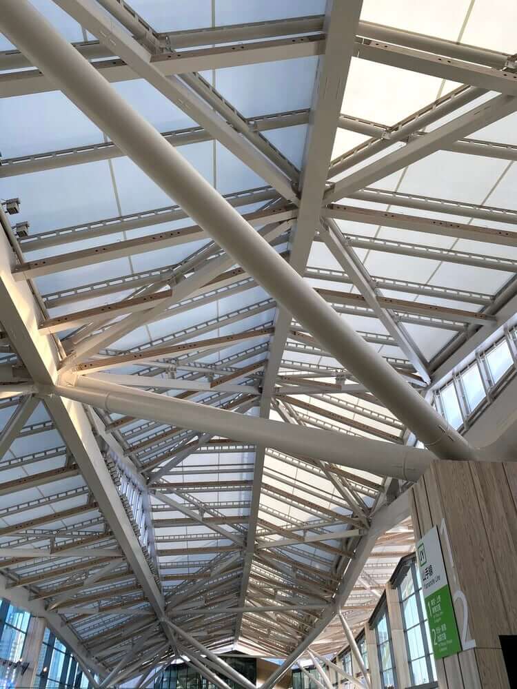 高輪ゲートウェイ駅は、東京と世界をつなぐ玄関口の役割を目指しているため、駅舎は「和」を感じさせるデザインとなっています。そんな駅舎のシンボルである折り紙をモチーフした大屋根に、「建築用ふっ素樹脂膜材 ChukohSky™ FGT」シリーズが使われています。障子のような優しい光を感じられるのは、透光性があるからです。照明がなくても明るいコンコースで、省エネにも貢献しています。また、燃えにくく、軽いという特性から、災害時の被害を軽減することが可能です。