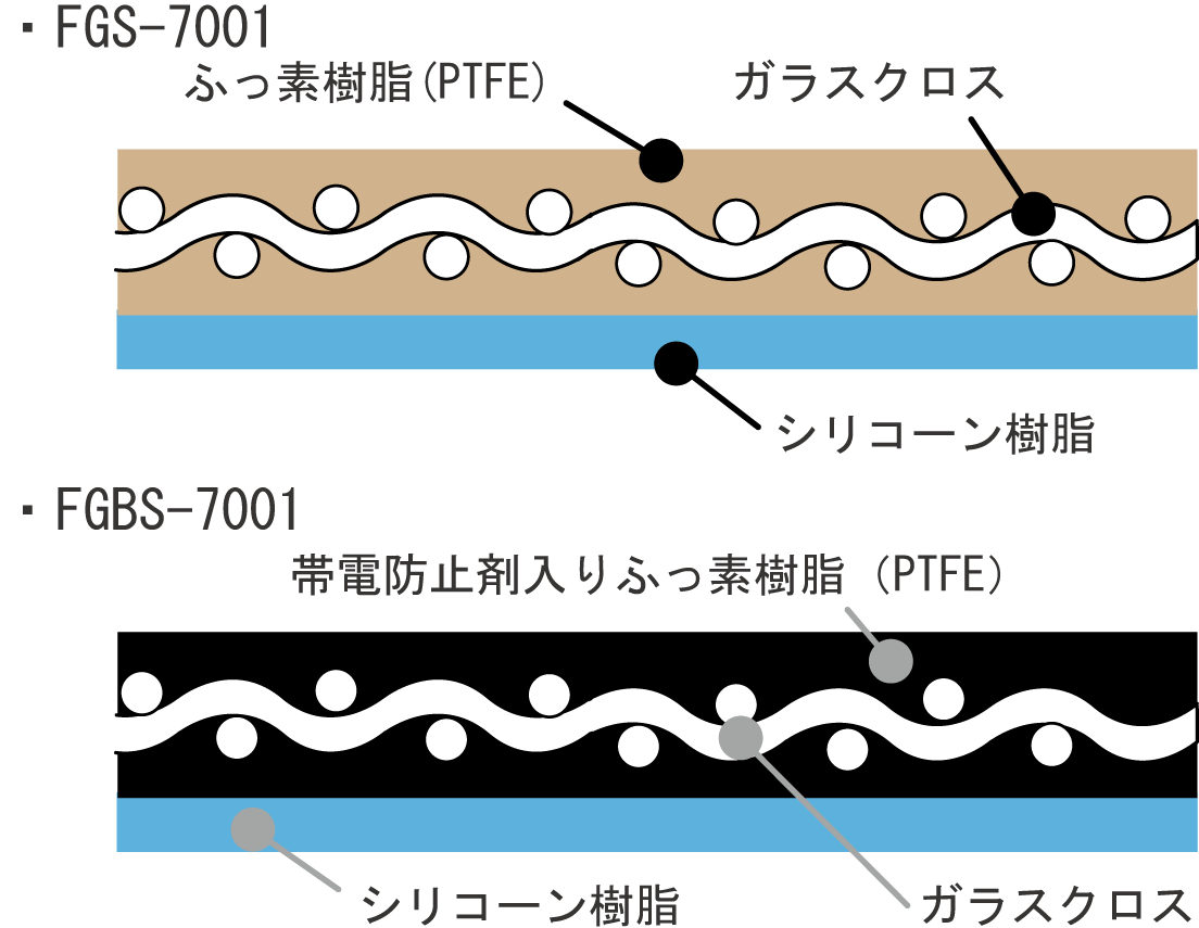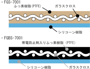 ガラスクロスの表面にふっ素樹脂、裏面にシリコーン樹脂をコーティングした機能性複合材料です。シリコーン樹脂のグリップ機能とふっ素樹脂の離型・滑り機能を合わせもっています。