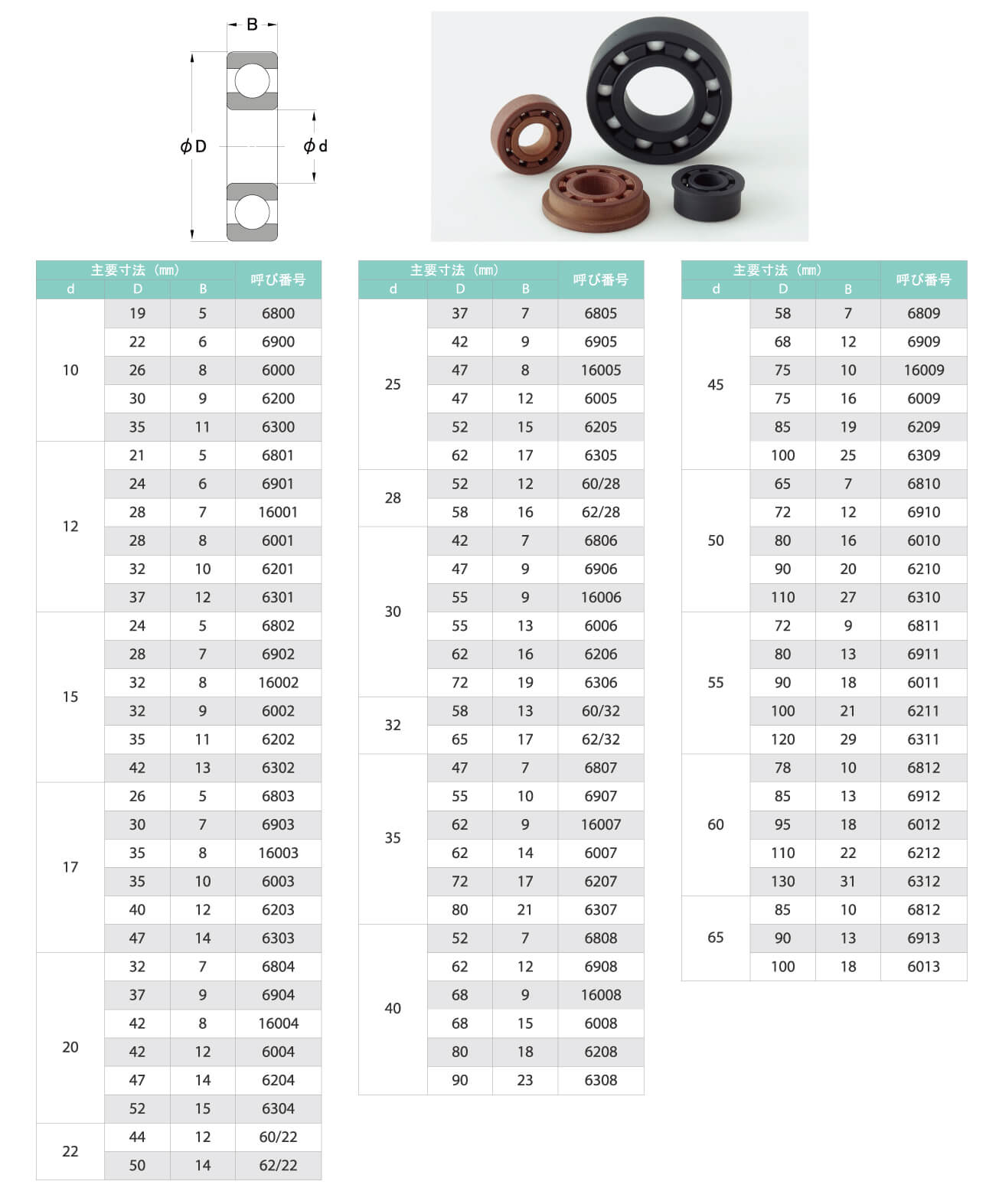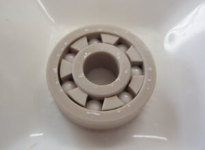 プラスチック製のボールベアリングです。水中、薬液中、強磁界、電気伝導などの特殊な環境で使用できるため、金属ベアリングで起こる錆び、腐食、オイル飛散、磁性や電通による故障といった不具合を解決します。