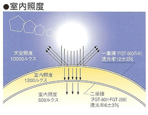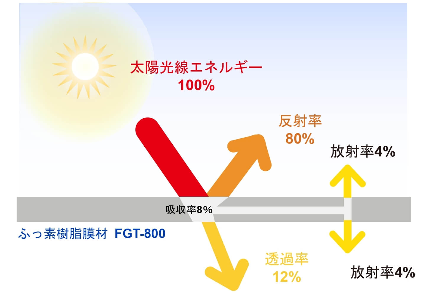 フッ素樹脂膜材は太陽光に対し高い反射率と低い吸収率、小さい熱容量により構造物内への太陽エネルギーの侵入を小さく抑えます。また半透明であるため昼間の人工照明は不要で、実質的なエネルギーコストが節約できます。