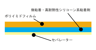 ポリイミドフィルムを基材とし、片面に高耐熱微粘着シリコーン系粘着剤を塗布した粘着テープです。糊残りが少ないため、高温環境下でのマスキング用途に最適です。