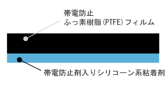導電性カーボン入りのふっ素樹脂(PTFE)フィルムを基材とし、導電性カーボン入りのシリコーン系粘着剤を塗布した製品です。厚み方向にも導電特性を有するため、テープを剥がした際の剥離帯電を抑制できます。PEコアを使用しているためクリーンルーム内でもご使用いただけます。