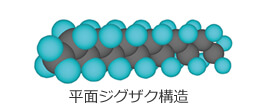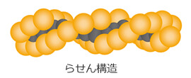 上記のように炭素とフッ素(C-F)の結合エネルギーが高いということは、“大きなエネルギーがかからない限り劣化しにくい”ということになります。またフッ素の原子は水素の原子に比べて大きいため、少しねじれた状態で結合し、独自のらせん構造となっています。このような分子構造のため、PTFEは耐熱性、耐燃焼性(耐酸化性)、耐候性、耐薬品性の特性を有しています。